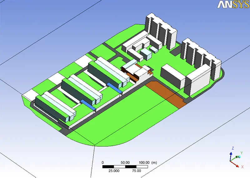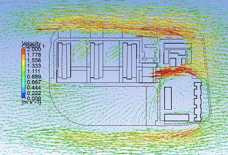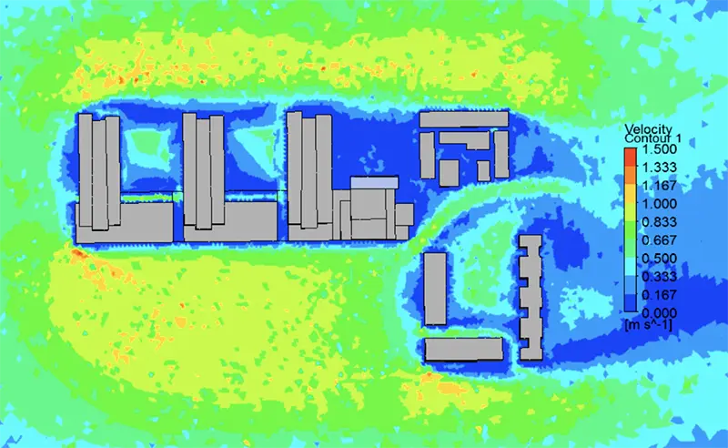 Dans notre étude de l’écoulement de l’air sur les lieux, nous nous sommes concentrés sur l’analyse de la distribution des conditions de vent extérieur, incluant la vitesse, les vecteurs de vitesse, la pression, et le facteur d’amplification de la vitesse du vent à travers le campus de l’école. À l’aide de simulations CFD, nous avons évalué différents scénarios et configurations d’aménagement du bâtiment en vue de comprendre comment ces facteurs influencent la ventilation naturelle et l’évaluation thermique globale.